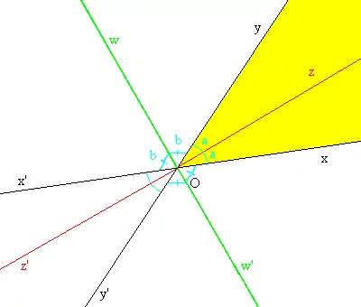 En la figura, la bisectriz del ángulo xOy (en amarillo) es (z'), y la del ángulo x'Oy es (w'). Se cortan formando un ángulo recto. En efecto, si llamamos a la amplitud de xOz, y b la de yOw, observamos que 2a + 2b es la amplitud del ángulo xOx' = 180°, es un ángulo plano. Luego zOw mide a + b = 90°.