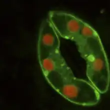 Imagen tomada con un microscopio confocal de un estoma de Arabidopsis thaliana mostrando dos células oclusivas cuyos contornos exhiben fluorescencia verde y los cloroplastos en color rojo.