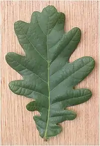 Las hojas de las dicotiledóneas pueden adoptar distintas formas, si bien usualmente son retinervadas. En la imagen, limbo foliar del roble (Quercus robur).