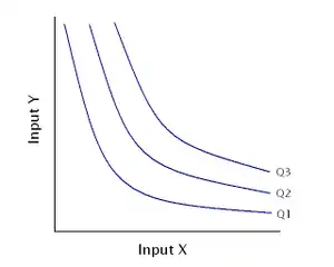 - aquella curva que muestra la combinación, de dos factores productivos, por lo general, Capital (K) y Trabajo (L), que puede producir un determinado nivel o volumen de producción (obviamente esta definición requiere la presencia de cierta cantidad de materias primas, que no se consideran factores productivos)