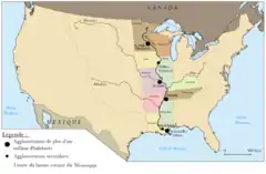 Los franceses reclamaron originalmente las tierras españolas situadas en ambos lados del río Misisipi, para unir Luisiana con el Canadá. Los siguientes estados fueron parte de Luisiana: Luisiana, Misisipi, Arkansas, Oklahoma, Misuri, Kansas, Nebraska, Iowa, Illinois, Indiana, Míchigan, Wisconsin, Minnesota, Dakota del Norte y Dakota del Sur.