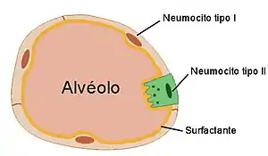 Los neumocitos tipo II representan el 60% del total de la población celular del alvéolo, pero ocupan solamente el 10% de la superficie alveolar.[2]