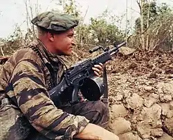 - Fusil automático Stoner 63/63A: El fusil automático dispara a cerrojo cerrado y es alimentado por un cargador de 30 balas insertado sobre el cajón de mecanismos. El alza y el punto de mira están situados en el lado izquierdo del arma para compensar la posición del cargador. El fusil automático no tiene modo semiautomático. Fue probado en combate por los Marines durante un corto periodo en 1967.