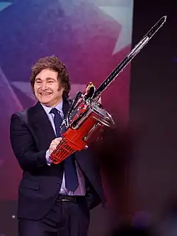 Autodefinido como anarcocapitalista en la teoría y minarquista en la práctica,[2] Milei es conocido por sus excentricidades políticas, como usar motosierras como utilería, ondear banderas negras y amarillas asociadas con el anarcocapitalismo[3] y usar lenguaje vulgar.[4][5][6][7][8] Milei popularizó «¡Viva la libertad, carajo!»[9][10] durante su campaña parlamentaria de 2021[11] y luego en su campaña presidencial de 2023.[12][13] La usa con mayor frecuencia como frase final en sus discursos[14][15][16][17] También la ha usado en los pies de foto de sus publicaciones en redes sociales, como en fotos con el entonces presidente de Estados Unidos, Donald Trump, y el actor y cineasta Sylvester Stallone.[18][19][20][21]