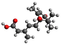 El ácido abscísico (abreviado como ABA) es una fitohormona con importantes funciones dentro de la fisiología de la planta. Participa en procesos del desarrollo y crecimiento así como en la respuesta adaptativa a estrés tanto de tipo biótico como abiótico.[1] Fue descubierta a principios de la década de los 60, cuando se halló su implicación en el control de la dormición de la semilla y la abscisión de órganos.[2][3][4] Hoy en día se sabe que en realidad es el etileno la hormona que principalmente interviene en la abscisión de órganos, y que la abscisión de órganos inducida por ABA observada en frutos de algodón es debida a la capacidad del ABA para inducir la síntesis de etileno.[5]