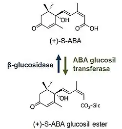 El ABA o sus metabolitos pueden ser inactivados mediante conjugación con otra molécula. El conjugado más común es el glucosil éster de ABA (ABA-GE), que se forma a través de una reacción de esterificación llevada a cabo por una glucosiltranferasa. Al contrario que la ruta oxidativa, la inactivación de ABA por conjugación con glucosa es un proceso reversible. La hidrólisis de ABA-GE la lleva a cabo una β-glucosidasa y resulta en la liberación de ABA. Además, la forma ABA-GE es no solo una forma de almacenamiento de ABA sino también de transporte. El ABA-GE se acumula en las vacuolas y en el apoplasto, pero se transporte al retículo endoplásmico en respuesta a deshidratación.