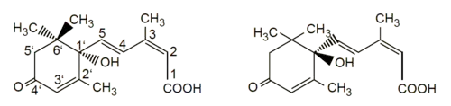 | (2Z,4E)-5-[(1S)-1-hydroxy-2,6,6-trimethyl-4-oxocyclohex-2-en-1-yl]-3-methylpenta-2,4-dienoic acid[6] | ||