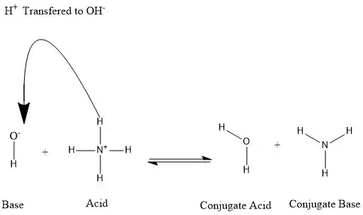 Decimos que la molécula de agua es el ácido conjugado del ion hidróxido después de que este último recibió el protón de hidrógeno donado por amonio. Por otro lado, el amoníaco es la base conjugada para el ácido amonio después de que el amonio ha donado un ion hidrógeno a la producción de la molécula de agua. También podemos referirnos a OH- como una base conjugada de H
