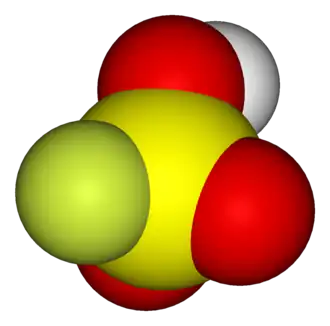 El ácido fluorosulfónico es FSO3H; es uno de los ácidos más fuertes disponibles comercialmente. También se conoce como ácido fluorosulfúrico. La molécula está mejor descrita por la fórmula FSO2OH, que enfatiza su relación con el ácido sulfúrico, H2SO4. El FSO3H es una molécula tetraédrica.