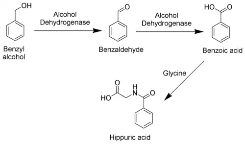 Bioquímicamente, el ácido hippúrico se produce a partir del ácido benzoico por acilación directa de la glicina. Es uno de los dos conjugados de ácido benzoico producidos metabólicamente, el otro es el glucurónido. Ambos se eliminan del cuerpo a través de la orina. El ácido benzoico entra en el organismo por ingestión (el benzoato de sodio se usa como conservante) y por hidrólisis de agentes farmacéuticos como el benzoato de bencilo.[6]