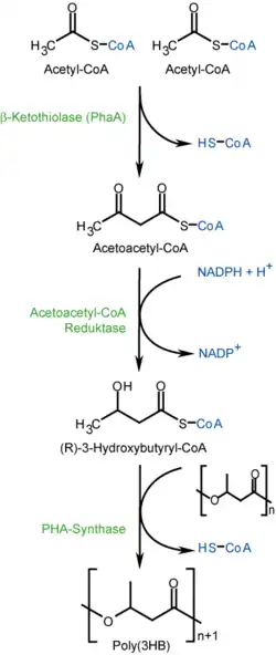 El PHB se produce en la naturaleza de manera natural por microorganismos (tales como Ralstonia metallidurans o Bacillus megaterium) aparentemente en respuesta a condiciones de estrés fisiológico; principalmente condiciones en las que los nutrientes son limitados. El polímero es principalmente un producto de asimilación de carbono (a partir de glucosa o almidón) y se emplea por estos microorganismos como una forma de almacenamiento de energía para ser metabolizados cuando otras fuentes de energía comunes no están disponibles. La biosíntesis microbiana de PHB comienza con la condensación de dos moléculas de acetil-CoA para dar acetoacetil-CoA que se reduce posteriormente a 3-hidroxibutiril-CoA. Este último compuesto se utiliza a continuación como un monómero para la polimerización del PHB.[3] Los gránulos de PHB se recuperan entonces a partir de las células.[4]