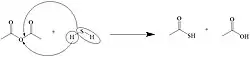 La mayor parte de la reactividad del ácido tioacético surge de la base conjugada, el tioacetato. Las sales de este anión,como el tioacetato de potasio, se utilizan para generar ésteres de tioacetato.[6] Los ésteres de tioacetato se someten a hidrólisis para dar tioles. Un método típico para preparar un tiol a partir de un haluro de alquilo usando ácido tioacético se desarrolla en cuatro pasos discretos, algunos de los cuales pueden realizarse secuencialmente en el mismo matraz: