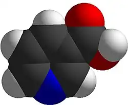 Este sólido incoloro y soluble en agua es un derivado de la piridina con un grupo carboxilo (COOH) en la posición 3.[23] Otra forma de la vitamina B3, la amida nicotinamida, reemplaza el grupo carboxilo por un grupo carboxamida (CONH