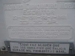 Fue su deseo expreso[4] el que figurase como epitafio en su tumba la frase textual y en gallego «Eiqui xaze alguén, que coa súa obra, fixo que Galicia durase mil primaveras máis» («Aquí yace alguien que, con su obra, hizo que Galicia durase mil primaveras más»), que actualmente figura en su sepultura, junto con otra que reza, textualmente y en gallego, «Loubado seña Deus que me permitiu facerme home neste grande reino que chamamos Galicia» («Alabado sea Dios, que permitió hacerme hombre en este gran reino que llamamos Galicia»).
