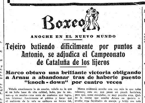 - 18 de octubre de 1932, Antonio Canet: En combate de semifondo en el Olympia, se enfrenta en 10 asaltos a Canet, campeón de levante de peso welter.[70] Tras una dura lucha en la que ambos sangran profusamente, los jueces declaran el combate nulo, lo que es considerado justo por los aficionados, que en pie brindan a los púgiles un aplauso cerradísimo.