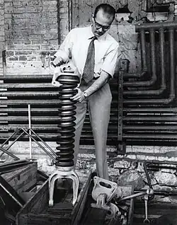 ![]() Ángel Torán con la suspensión de la rueda del Talgo II, factoría de ACF en Wilmington (EEUU), 1947. | ||