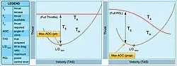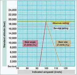 La velocidad de un tipo de aeronave a la que el ángulo de ascenso es mayor se denomina VX. Siempre es más lenta que VY, la velocidad para la mejor tasa de ascenso. Como este último proporciona la forma más rápida de ganar niveles de altitud, independientemente de la distancia recorrida durante dicha maniobra, es más relevante para el crucero. El ángulo máximo de ascenso, por otro lado, es donde la aeronave gana la mayor altitud en una distancia dada, independientemente del tiempo necesario para la maniobra. Esto es importante para superar un obstáculo y, por lo tanto, es la velocidad que utiliza un piloto cuando ejecuta un despegue de «campo corto». VX aumenta con la altitud y VY disminuye con la altitud hasta que convergen en el techo de vuelo del avión.[2]