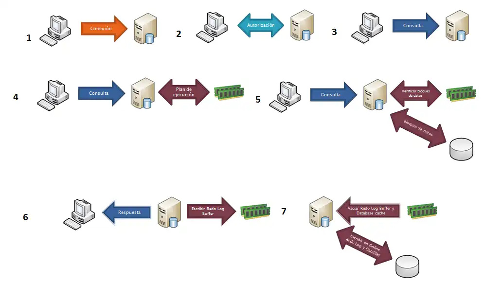 - 6.Luego el cliente recibe una respuesta si en dado caso la consulta fue modificada se escribe en el redo log buffer y se actualiza en cache. El cliente se desconecta.