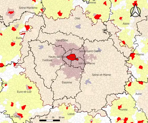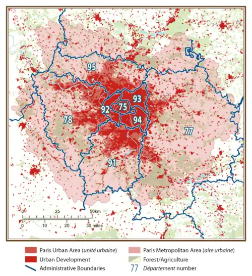 A partir de 2022, el área metropolitana de París estadística del INSEE cubre 1929 municipios.[14] Con sus 18 941 km², se extiende significativamente más allá de la región administrativa de Isla de Francia de París (12 012 km²).[15] Fuera de la región de Isla de Francia, cubre parte de los departamentos de Aisne, Aube, Eure, Eure-et-Loir, Loiret, Marne, Oise, Sena Marítimo y Yonne.[14]