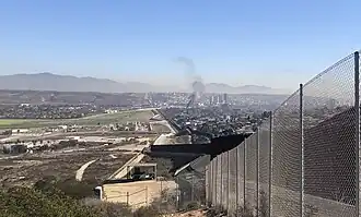 De arriba a abajo de izquierda a derecha:Vista de San Ysidro-Tijuana, Downtown de San Diego, Skyline de Tijuana, Muro fronterizo en Playas y Garita Internacional de Otay. | ||||||||