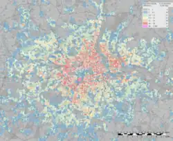Un aumento dramático en la expansión urbana de la ciudad comenzó en el siglo XIX, cuando los trabajadores llegaron en masa desde el campo para laborar en las nuevas fábricas que entonces surgían. Se construyeron grandes desarrollos de pequeñas casas adosadas, y los nuevos sistemas de transporte público —(el Metro, autobuses y tranvías)— permitieron a los trabajadores desplazarse diariamente al centro. También surgieron distritos suburbanos alrededor del núcleo urbano para aquellos que deseaban escapar de las condiciones insalubres de la ciudad industrial.[5]