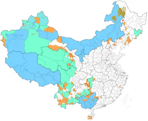 A partir de 2003, China ha establecido 155 áreas autónomas étnicas, a saber, 5 regiones autónomas, 30 prefecturas autónomas y 120 condados autónomos (denominadas banderas las que se encuentran en la Región Autónoma de Mongolia Interior). Además, hay 1,173 municipios étnicos, un sumu étnico y un gran número de aldeas étnicas y otras organizaciones étnicas autónomas de base. Según el quinto censo de China continental realizado en 2000, 44 de las 55 minorías étnicas identificadas habían establecido regiones autónomas; La población de minorías étnicas que implementa la autonomía étnica regional representó el 71% de la población total de minorías étnicas, y el área de las regiones autónomas étnicas representó aproximadamente el 64% del territorio total.