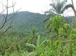 - Monte Kupe. Es una montaña plutónica en el altiplano occidental de Camerún, que forma parte de la línea de volcanes de Camerún. Es la más alta de las montañas Bakossi, con 2064 m .[39] Tiene 4 ríos, Manyu, Nkam, Moungo y Woun, protegidos por el Parque nacional de Bakossi. En la zona de las fuentes hay mandriles y chimpancés, así como colobos, cercopitecos y otros mamñiferos como los duikers. El bosque llega hasta los 1500 m en el este, y hasta los 750-1100 en el oeste.[40]