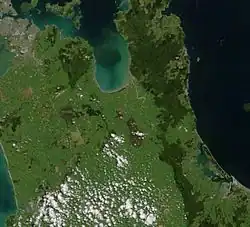 - Kopuatai Peat Dome, 102 km², 37°25′S 175°33′E. Área de conservación en régimen de mayordomía, es decir, que es una zona privada con un régimen especial de conservación. El mayor hábitat ácido intacto (raised bog) de Nueva Zelanda, rodeado por pantanos y lagunas asociadas, una zona importante para aves y plantas amenazadas con invertebrados notables. Se usa para la caza de aves.[20] Consiste en dos pequeños domos de unos tres metros de altura en el centro, uno en el norte y otro en el sur. La mayor parte es ombrotrófica, es decir, que recibe el agua de la lluvia, ácida y con pocos nutrientes.