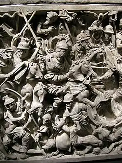 Detalle de un sarcófago del siglo II a. C. que muestra una carga de la caballería romana. Museo Nacional Romano, Roma, Italia.