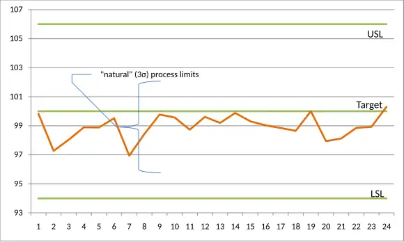 Considere una característica de calidad con un objetivo de 100.00 μm y límites de especificación superior e inferior de 106.00 μm y 94 μm respectivamente. Si después de supervisar el proceso cuidadosamente por un rato, parece que el proceso está bajo control y produce salidas con previsibilidad (como se muestra en el gráfico de ejecución de abajo), podemos estimar significativamente su media y desviación estándar.