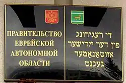 Placa bilingüe de la sede del gobierno del Óblast Autónomo Judío. Derecha: yidis; izquierda: ruso.