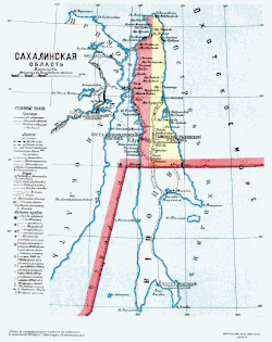 ![]() Mapa de la óblast de Sajalín en 1913. | ||||||||||||||||||||||||||||||||||