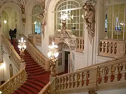 La escalera principal decorada comienza con una media expandiéndose y se divide en dos tramos de escaleras que conducen a las galerías que rodean la planta superior. Se ramifican a partir de ahí, con las puertas de los balcones. La utilización de una escalera central también puede encontrarse en la Ópera de Viena, la cual sirvió de modelo para la Ópera de Graz. Realzando el carácter de barroco festivo, representativo del interior del edificio a través de la decoración opulenta de la sala donde se encuentra la escalera, de mármol blanco con ornamentos de oro y candelabros de bronce, con esculturas en las balaustradas. Este tipo de diseño es típico de los arquitectos Fellner y Helmer, cuando se trataba de sitios con amplias expectativas.[14]