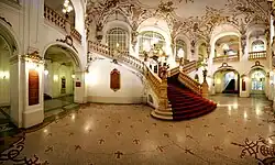 «Fue diseñado y ejecutado por los arquitectos Fellner y Helmer de Viena, en al estilo barroco de Fischer von Erlachs, tiene un largo de 81,50 metros y un ancho máximo de 48 metros, y tiene una superficie de 3 211 metros cuadrados».[7]Ludwig Muhry, arquitecto en jefe ejecutante.