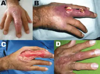 ![]() Úlcera de Buruli en manos. | ||