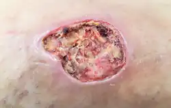 Úlcera venosa o úlcera varicosa es un tipo de úlcera producida por un funcionamiento deficiente del sistema venoso, generalmente en las piernas. Es la primera causa y representan entre un 70 y 90% de las lesiones crónicas. [1] Suelen desarrollarse fundamentalmente a lo largo de la zona distal y medial de la pierna.