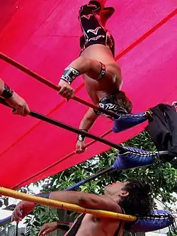 - Senton de la muerte (Turnbuckle handstand transitioned into a diving seated senton)[9][10]