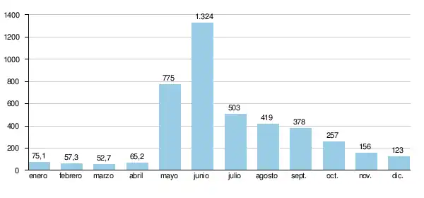 El caudal medio mensual observado en marzo (mínimo de estiaje) es 41,7 m³/s, o menos del 2% del caudal medio en junio (2.374 m³/s), lo que pone de relieve la magnitud de las extremas variaciones estacionales. Y las diferencias mensuales pueden ser aún más importantes, ya que en el período de observación de 55 años, el caudal mínimo mensual fue del 26,9 m³/s, en marzo de 1956, mientras que el máximo mensual fue de 3.930 m³/s en junio de 1981. En lo que respecta al período libre de hielo (de mayo a septiembre inclusive), el caudal mínimo observado fue de 351 m³/s en septiembre de 1954.
