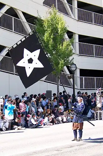 Un abanderado en el desfile de Aizu en 2006 con la bandera del Ōuetsu Reppan Dōmei | ||