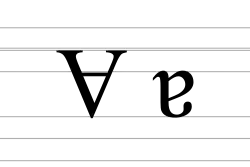El símbolo lógico ∀, tiene la misma forma que una mayúscula sans serif convertida en A. Se utiliza para representar el cuantificador universal en lógica de predicados, donde normalmente se lee como "para todos". Fue utilizado por primera vez de esta manera por Gerhard Gentzen en 1935, por analogía con la notación Ǝ de Giuseppe Peano para el cuantificador existencial y el uso posterior de la notación de Peano por Bertrand Russell.[3] En ingeniería de tráfico se utiliza para representar el flujo, el número de unidades (vehículos) que pasan un punto en una unidad de tiempo. También se puede utilizar en tarifas unitarias.