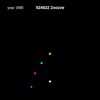 ![]() Animación de la órbita de Zoozve desde el año 1600 al 2500, en relación con el Sol (amarillo), Venus (blanco), Mercurio (verde) y Tierra (azul) | ||