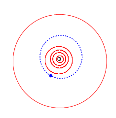 ![]() Órbita de Tiziano (en azul) alrededor del Sol (en negro). En rojo, las órbitas de los planetas, siendo la más exterior la de Júpiter. | ||