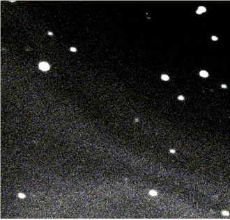 El asteroide Apofis. Se le puede apreciar en el centro de la imagen, moviéndose de derecha a izquierda, tomado el 30 de diciembre de 2004. (Osservatorio Astronómico Sormano)