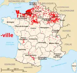 En Francia, después del siglo VI, especialmente en el norte, en primer lugar Normandía (donde el 20% de las comunas terminan en -ville), Beauce y la parte francófona de Lorena. En cambio, en el sudeste francés, son excepcionales y modernos. En el suroeste, -ville es a menudo una traducción del occitano -viala (en gascón -viela), a veces mal francofonizado en -vielle (o -fielle). Casi todos se combinan con el nombre de un antiguo amo de las tierras, por ejemplo Colleville (en Normandía), donde Colle- representa un nombre de pila nórdico antiguo Koli. El ejemplo más antiguo registrado de un topónimo -ville en Normandía es Bourville como Bodardi Villa en el 715 d. C. Ciertas estadísticas indican que hay 1.068 comunas francesas con terminación -ville, de un total de 36.591 comunas que hay en Francia (si excluimos las variantes del suroeste como -viale, -viel[l]e o -fielle), pero 460 de esas 1.068 se encuentran en Normandía (más de un tercio) para un número total de 3.332 comunas en Normandía.[1]