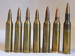 Izquierda a derecha: .17/223 Norma Experimental, .17-223 Frankford Arsenal Experimental F A 7 2, .17-223 Frankford Arsenal Experimental F A 7 3, 4.3x45 D.A.G. Experimental DAG 4.3X45, 4.9x45 D.A.G. Experimental DAG .223, 4.7x45 Experimental DAG 4.7 MM, 4.85x49 Experimental XL1E1 RG 77 4.85 | ||||||||||||||||||