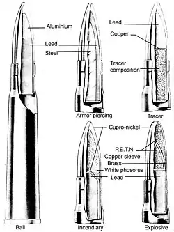 - Incendiaria: Bala de 8,6 g, una camisa de latón con fósforo blanco y núcleo de plomo. Fulminante pintado de color verde.