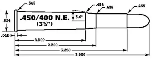 Despide una bala enchaquetada de 400 granos cargadas con 56 - 60 g de cordita, a una velocidad de 2,150 pies por segundo (660 m/s).Los rifles 450/400 NE 3¼pulgadas eran más pesados y el mínimo considerado para la caza de animales peligrosos.
