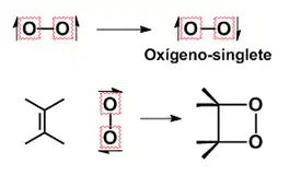 El oxígeno molecular es capaz de reaccionar con alquenos a través de un proceso de ciclación 2+2. Para ello, es necesario que el oxígeno se encuentre en un estado excitado (estado singlete) con la ayuda de una radiación y colorante.