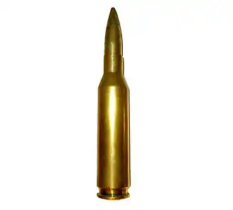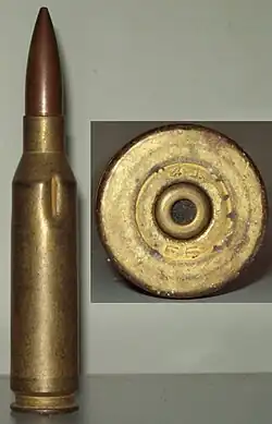 - (Antiblindaje/incendiaria) Cartucho con núcleo de acero templado, revestido de cobre. El proyectil tiene un peso de 64 g y una velocidad de salida estimada en 1.006 m/s. La capacidad de penetración hasta 500 m es de 32 mm de RHA a un ángulo de 90 grados.