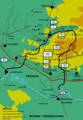 - ↑ Babić, Lazo (15 de mayo de 1994). «Pripremni materijal Komande 18. korpusa SVK za sastanak i raspravu s predstavnicima UNPROFOR-a o provedbi Zagrebačkog sporazuma o prekidu vatre» [Material preparatorio del Comando 18 del Cuerpo de SVK para la Reunión y Discusión con Representantes de UNPROFOR sobre la Implementación del Acuerdo de Zagreb]. edoc.site (en serbocroata). Okučani. p. 409. Consultado el 23 de noviembre de 2018.
